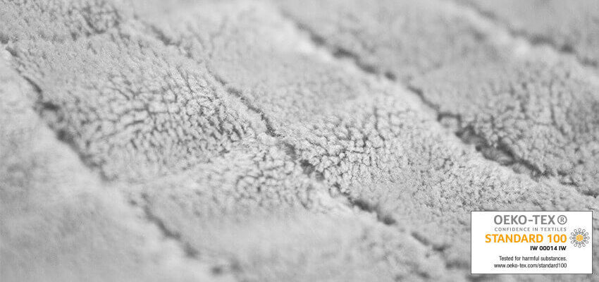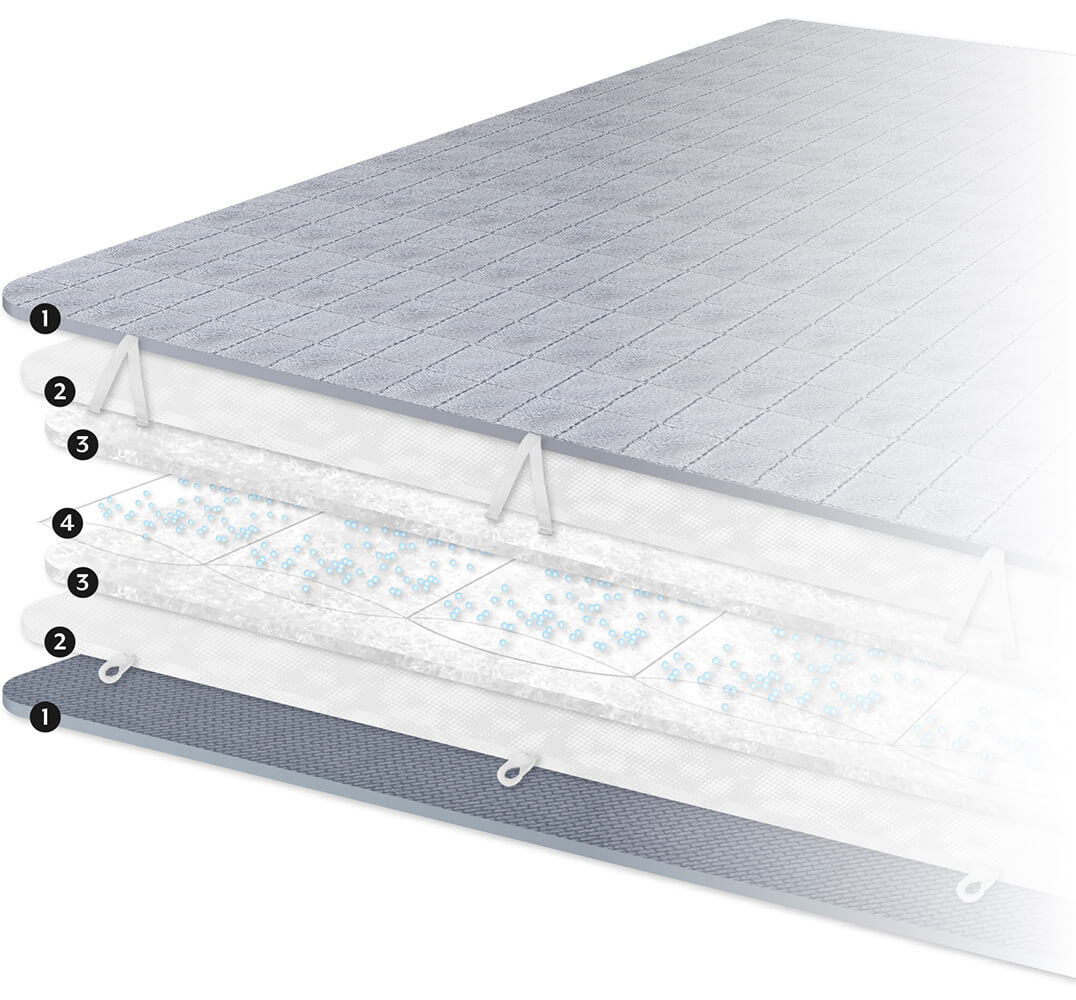 Nos couvertures se composent de la couverture souple (1) et du coutil épais (2). La couverture (1) a des boucles pour que le coutil ne glisse pas. Il peut être facilement retiré et lavé. Le coutil (2) est composé à 100% de coton biologique et contient une couche intermédiaire (3) dans laquelle les billes de verre lestées (4) sont uniformément incorporées. Nous n'utilisons que des matériaux provenant d'Europe.